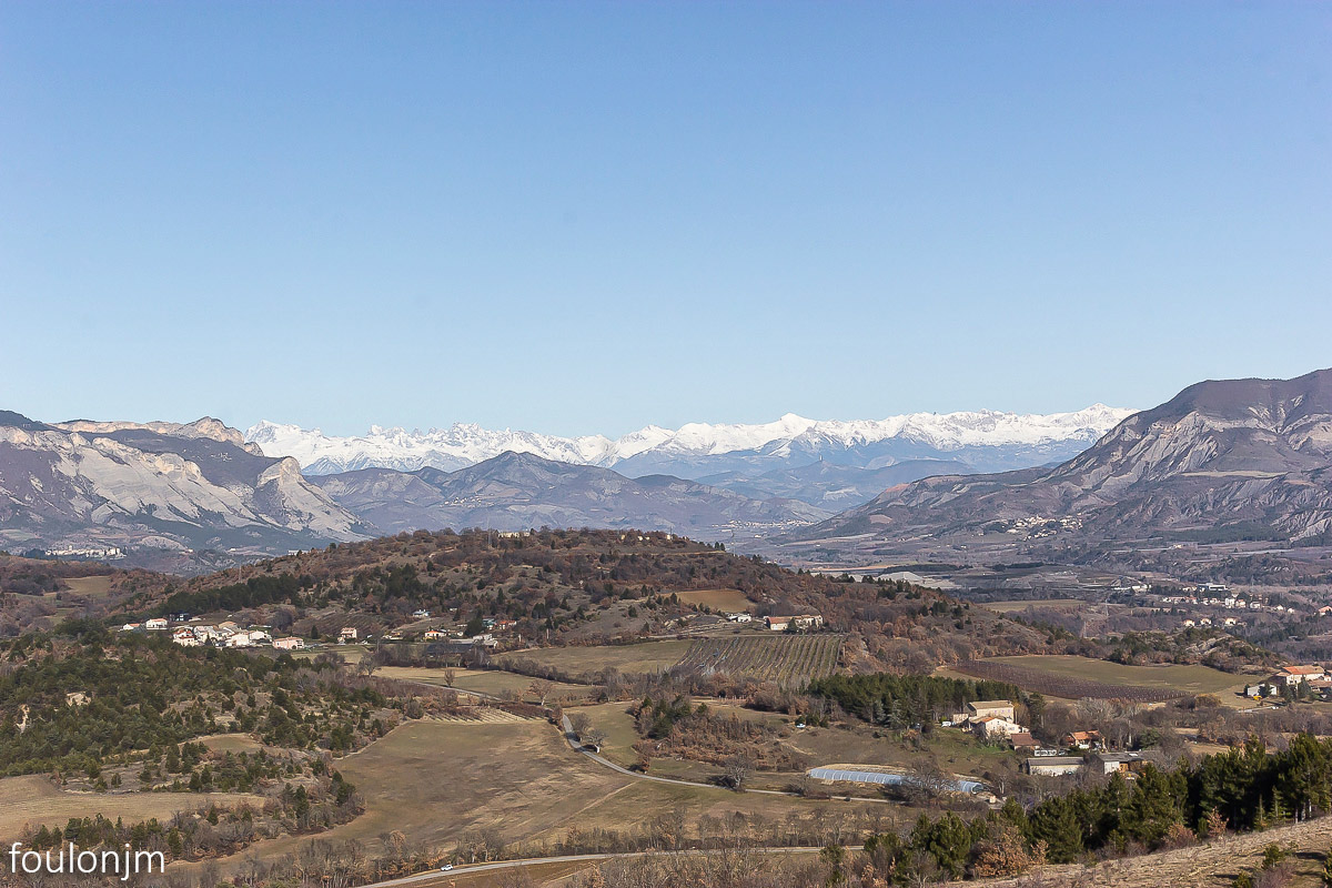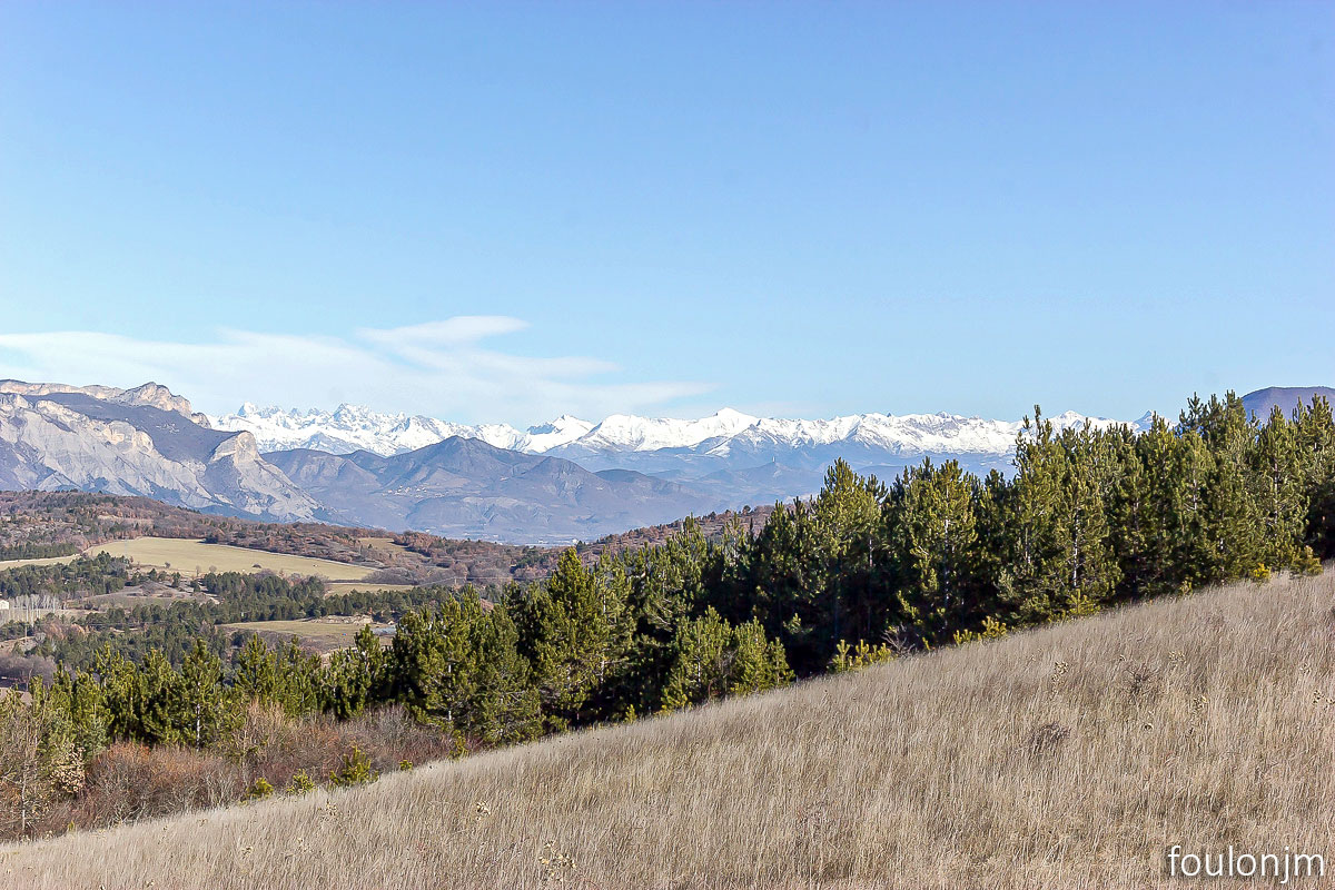 Vue vers le Nord. Au loin, la chaîne de montagne des Ecrins ...