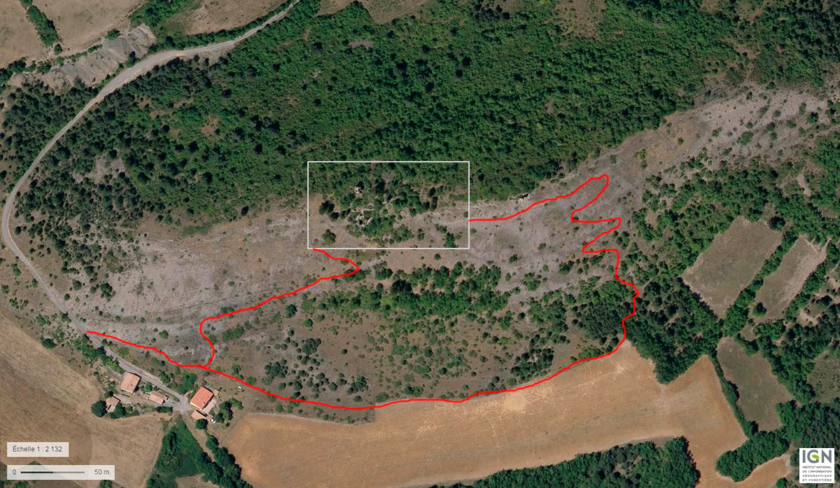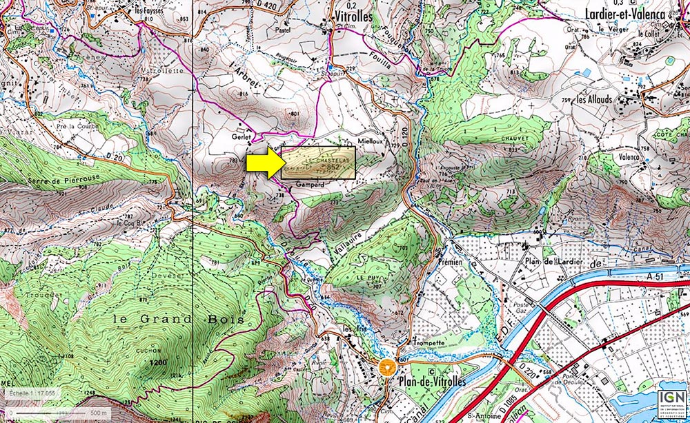 2La Chastelas - Vitrolles Hautes-Alpes (XIIe - XIVe) Vue satellite IGN Géoportail - Encadré en blanc, le site. En rouge le trajet allez/retour pour s'y rendre au départ du hameau de Gampard