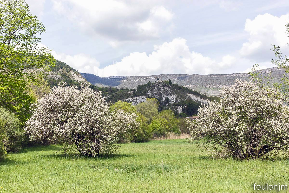 30Barret sur Méouge - Hautes Alpes Début mai 2022 - Le printemps ! Au loin sur sa butte, au centre la chapelle ruinée des Pénitents