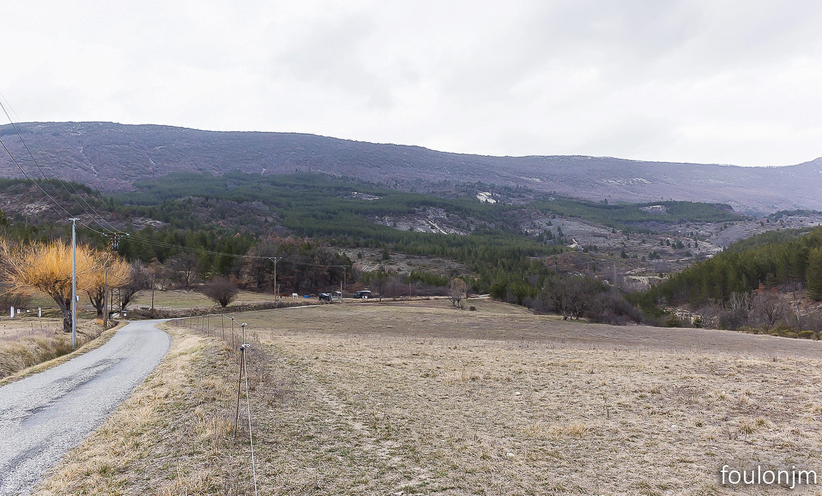 43Barret sur Méouge - Hautes Alpes Vue vers l'entrée des gorges de la Méouge. Il est tôt, il fait - 8°. A droite, la montagne de St Cyr (1211m)