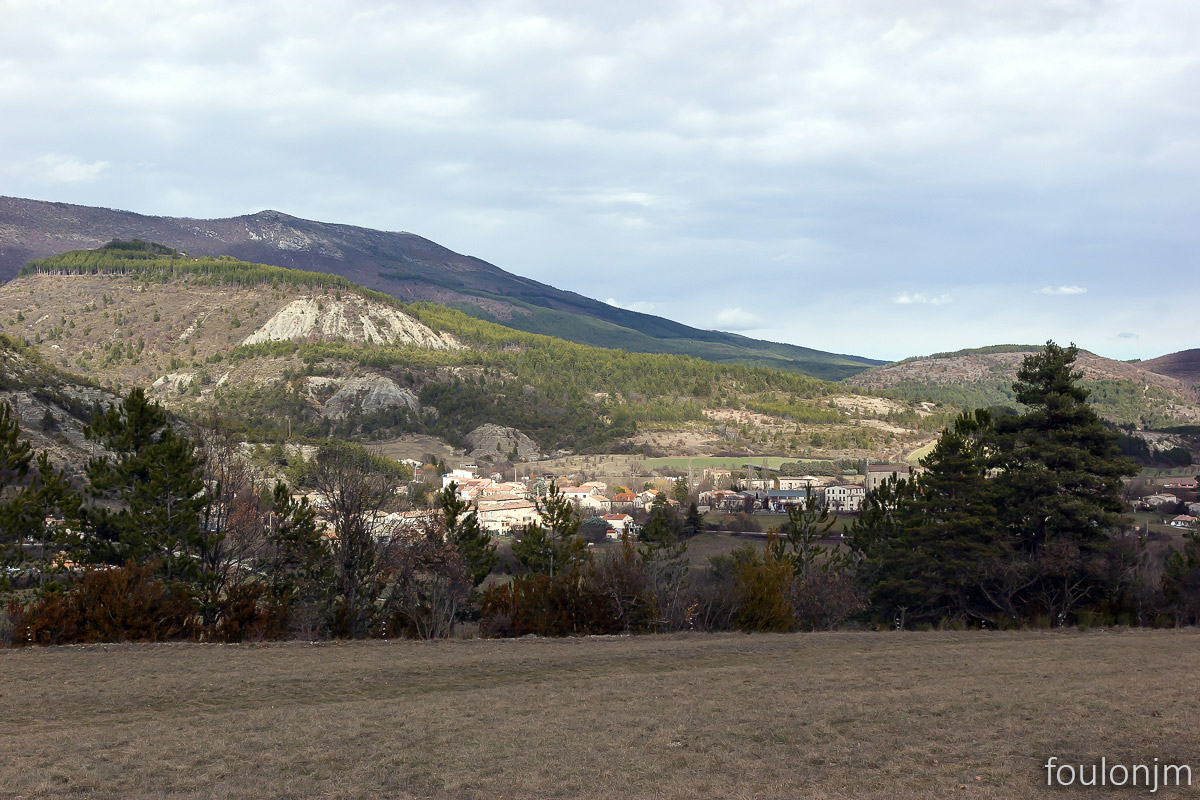 3Barret sur Méouge - Hautes Alpes Vue vers l'Est. Le village de St Pierre Avez. Au loin sur la gauche, la montagne de St Cyr (1365m) et le col de St Pierre (1269m)