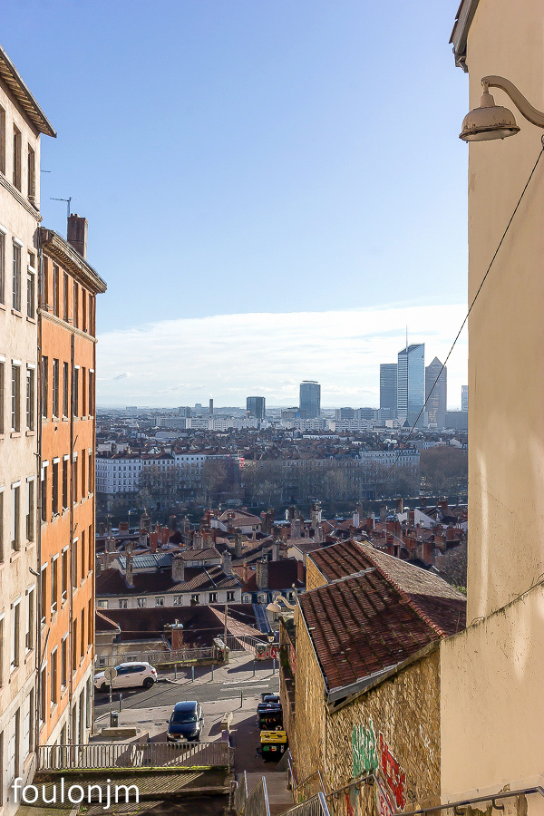 31Lyon - 3 janvier 2024 Lyon - En descendant vers le Rhône. Au loin les grandes tours dont celle dite du crayon et à sa gauche, Incity surnommée la gomme ...