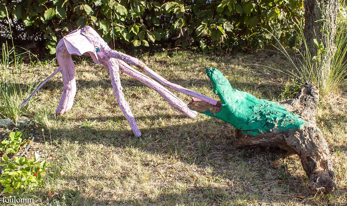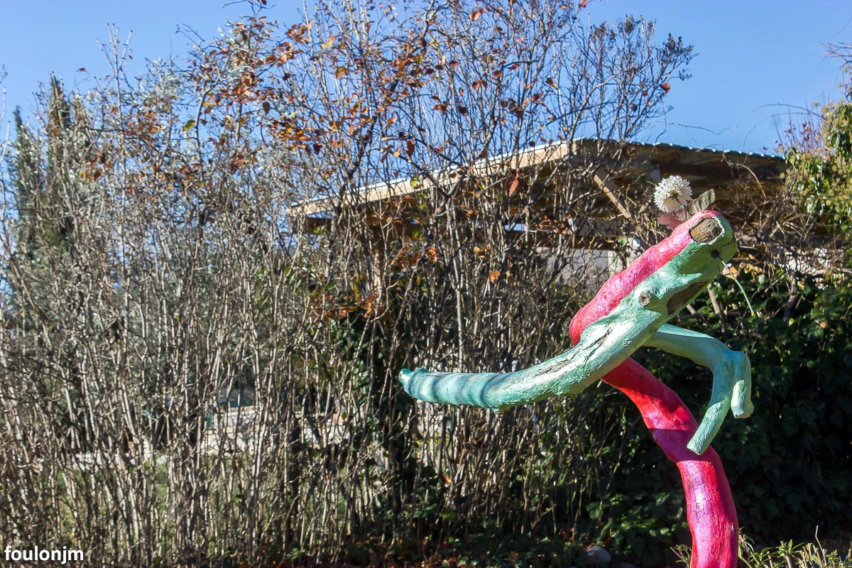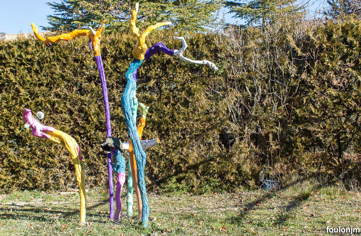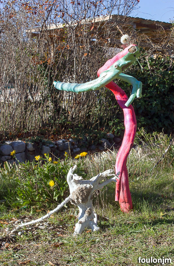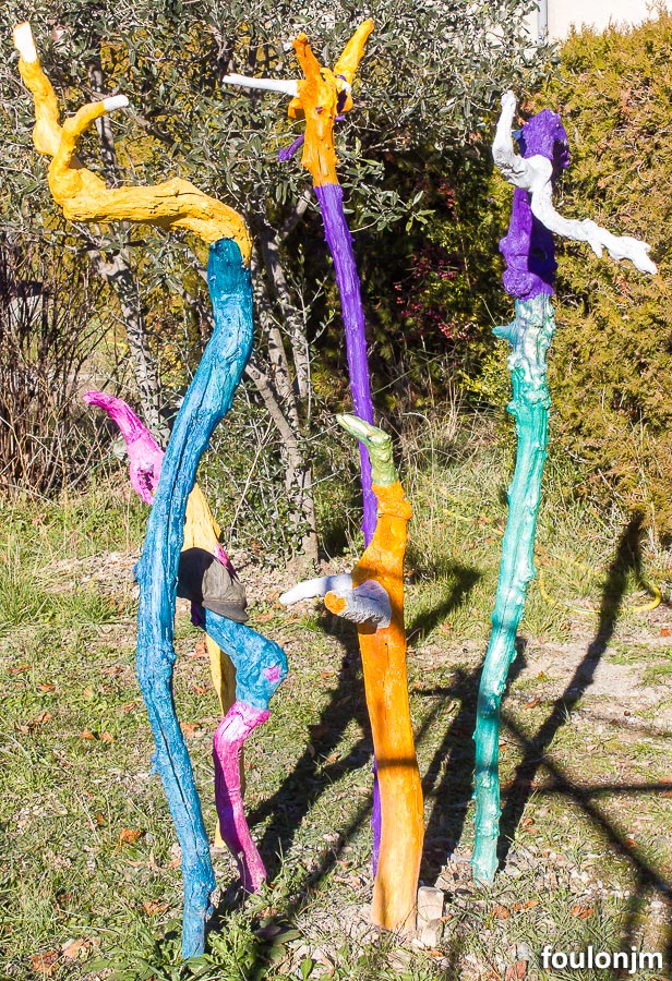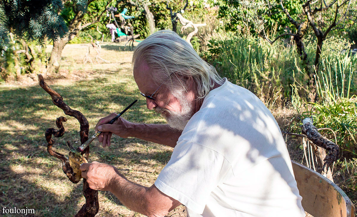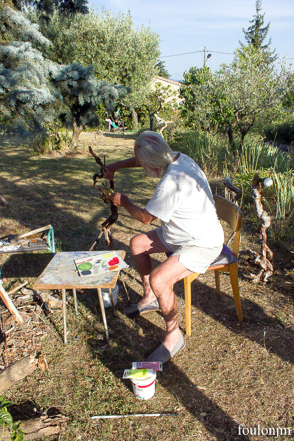 L'artiste peintre Jean-Pierre Marimot se passionne également pour les bois flottés qu'il ramasse lors de balades dans les rivières et torrents. Il les met en scène réhaussés de couleurs dans le jardin de sa maison de Sisteron en Haute Provence.