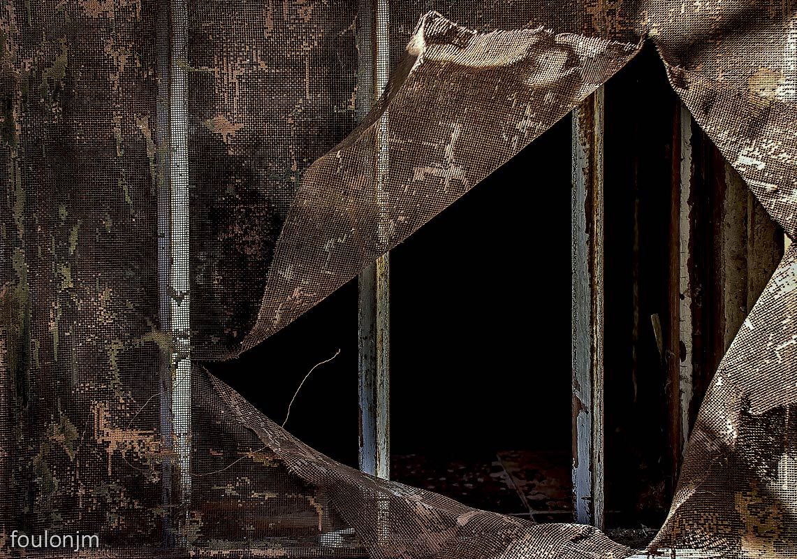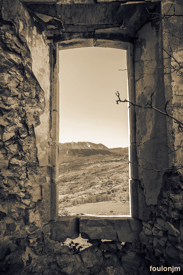 69Sépia - Filtres - N&B partiel La montagne de Lure par une fenêtre de l'ancienne auberge du vieux village médiéval ruiné de Noyers (Alpes de Haute Provence)