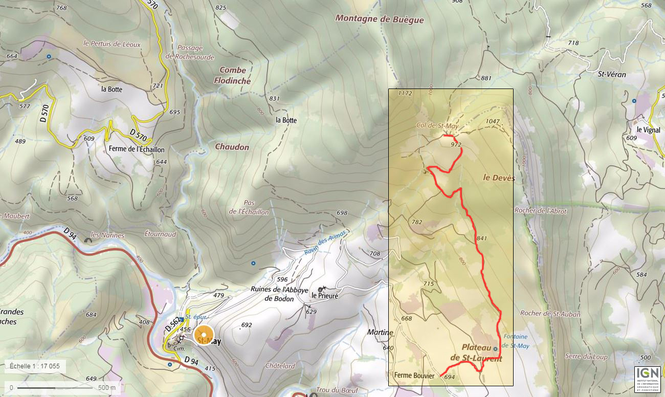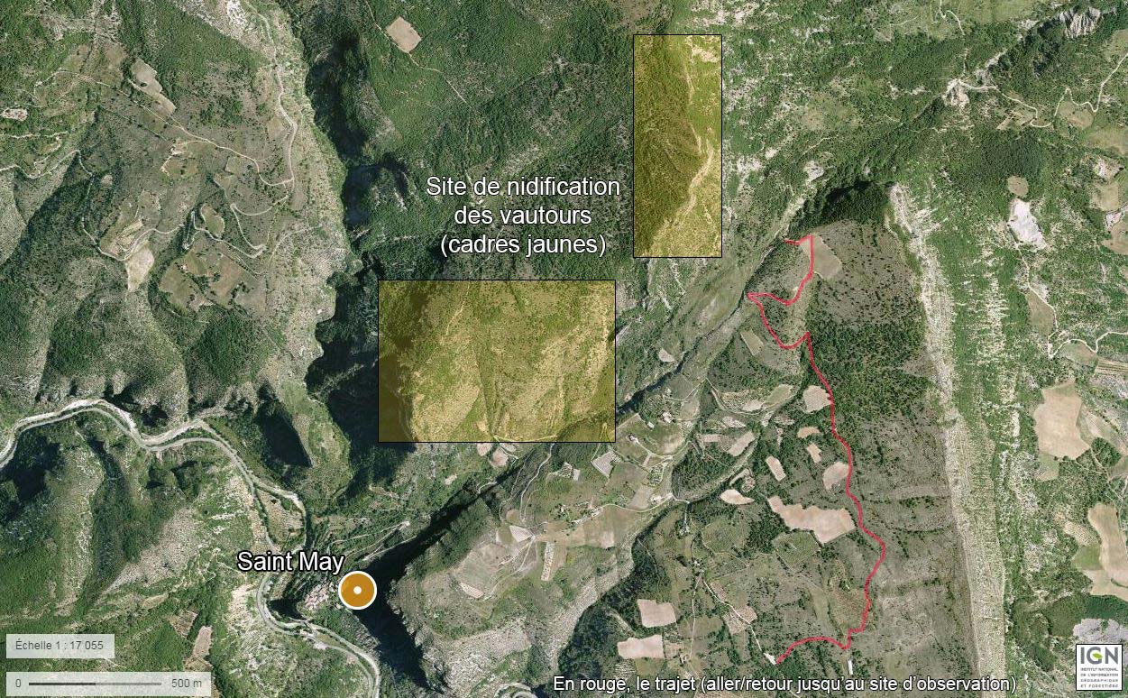 49St May - Col de St May Carte IGN vue satellite. En jaune le site de nidification de Saint May. En rouge le trajet pédestre aller/retour pour rejoindre le col de Saint May. Endroit idéal pour l'observation des vautours en vol.
