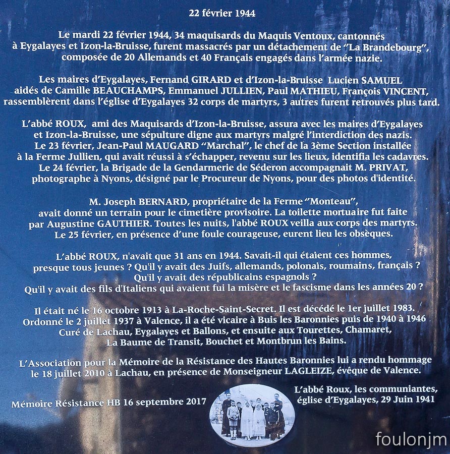 Plaque explicative de ce qui s'est passé ici en 1944 sur la façade Est de l'église