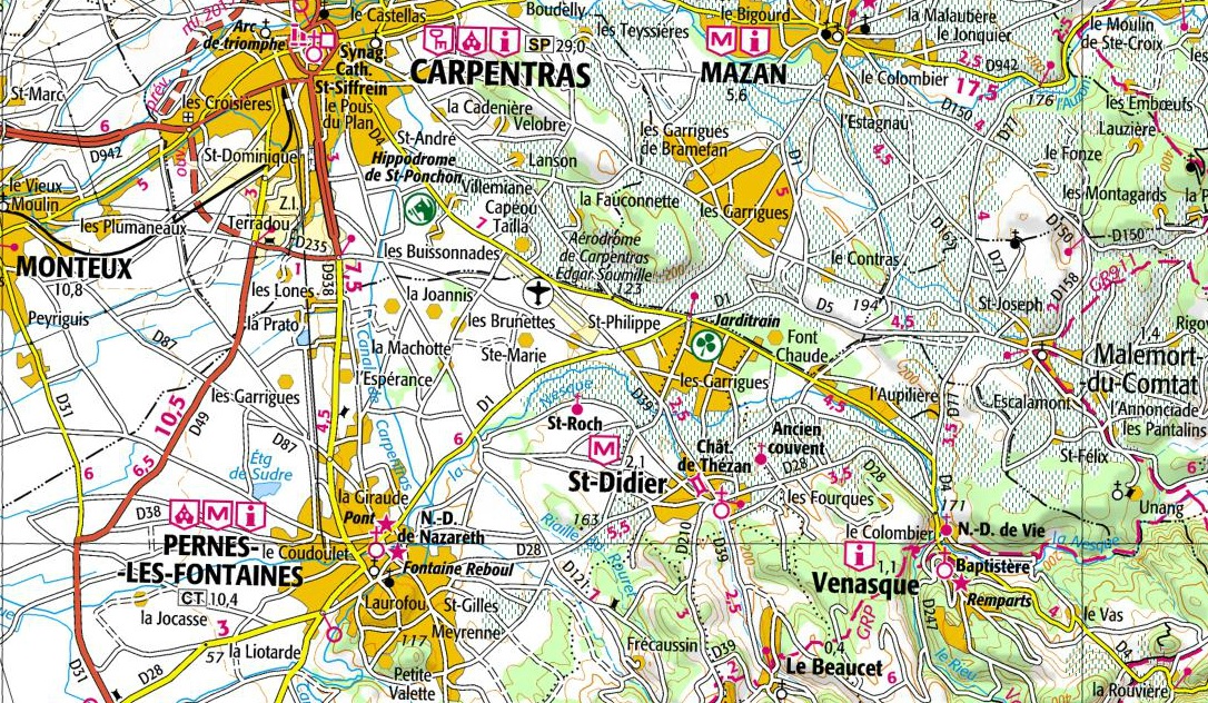 1 Vénasque - Le village est à environ 11 km au sud-est de Carpentras par le CD 4, puis le CD 28 et à une trentaine de km d'Avignon .
