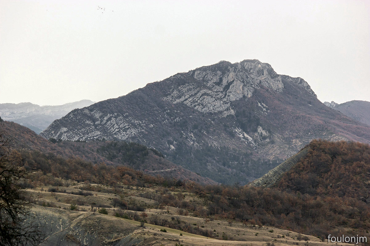 16Du côté de Bevons un jour pluvieux d'hiver Zoom sur la Baume (1145m). A gauche le Molard (918m). Entre les deux la vallée de Durance et Sisteron. A droite, Pierre avon (668m)