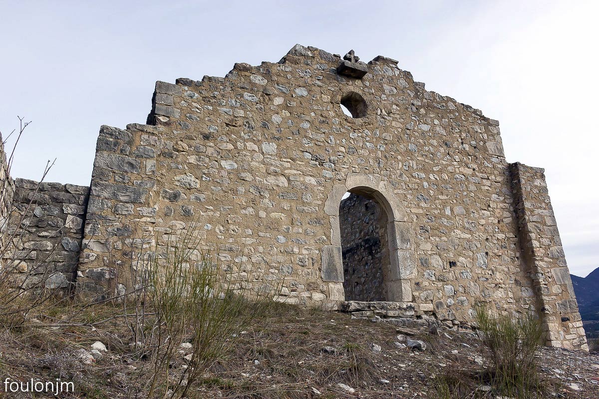 19Chapelle Saint Laurent (XIIe) - Barret sur Méouge Façade Sud de la chapelle qui comprends l'unique entrée ainsi qu'un oculus centré au dessus, lui même surmonté d'une petite croix