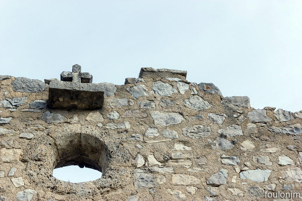 27Chapelle Saint Laurent (XIIe) - Barret sur Méouge La petite croix et l'oculus au dessus de la porte d'entrée