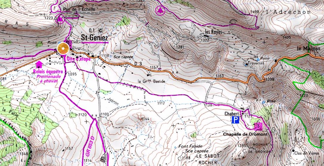 1Chapelle de Dromon - Saint Geniez On accède à la chapelle de Dromon par Saint Geniez puis le hameau de Chabert ou l'on se gare. Un chemin nous y mène ensuite