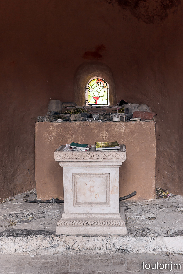 75Chapelle Saint-Pons - XIIe L'autel. Au centre de l'abside, se trouve une petite ouverture en arc ou un vitrail assez récent à été placé