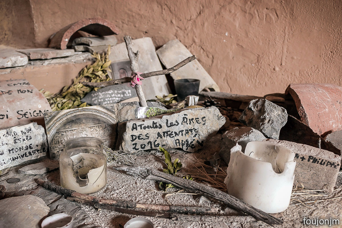 78Chapelle Saint-Pons - XIIe On y trouve aussi des bougies ainsi qu'une petite croix réalisée avec deux bouts de bois liés entre eux
