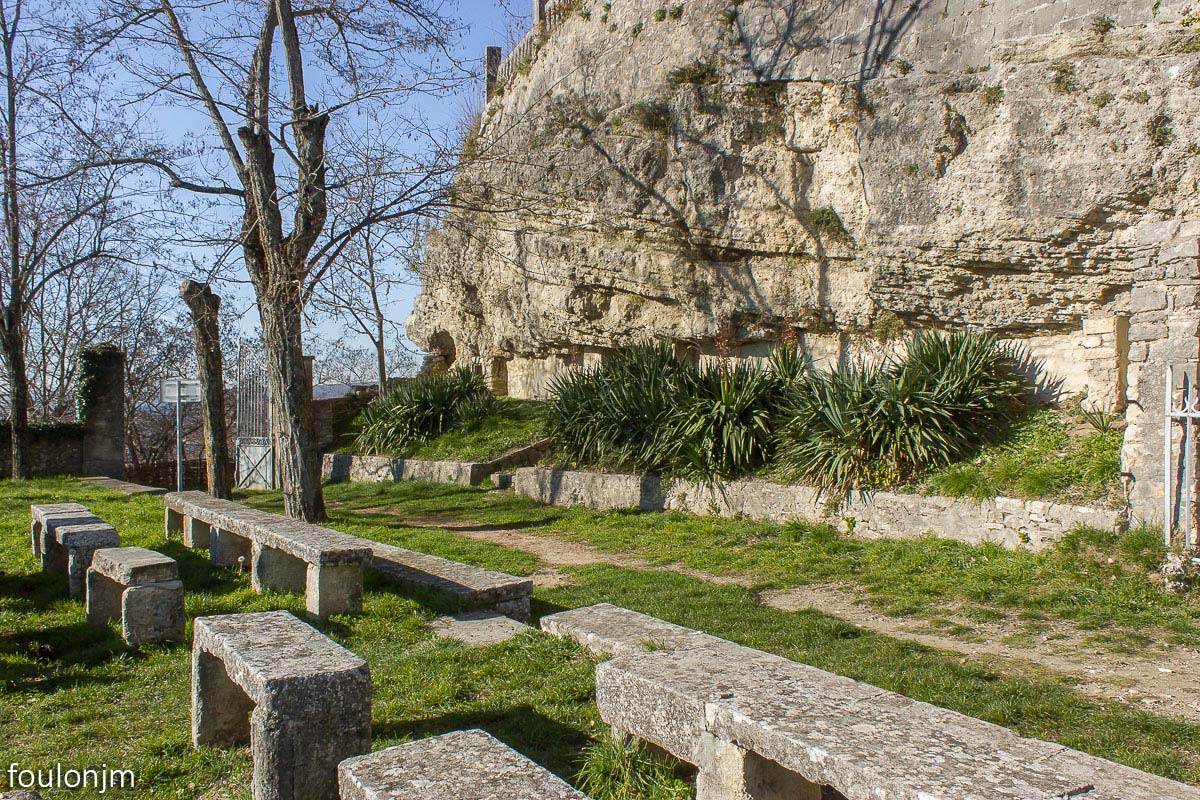 17Forcalquier - ND de Provence (1875) Bancs devant une cavité dans la roche qui acceuille un hôtel