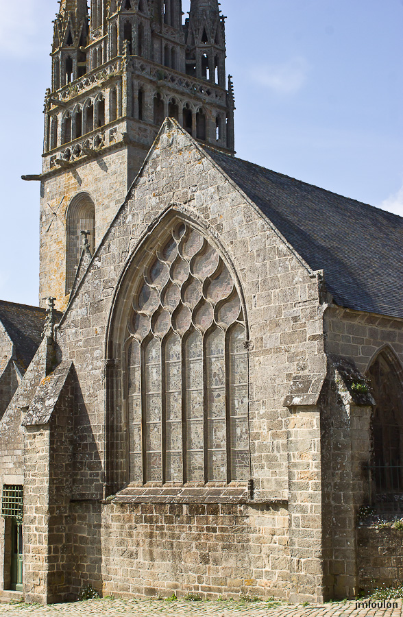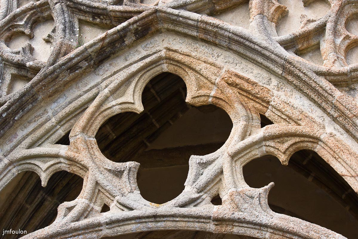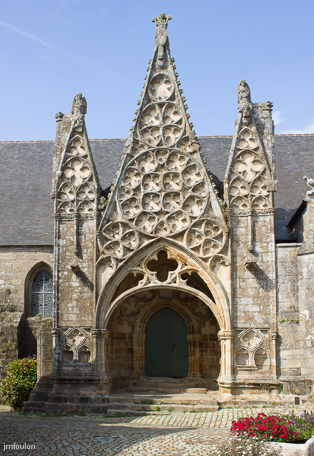20Pont-Croix Notre-Dame de Roscudon (XIIème siècle) - Le porche, véritable dentelle de pierre, érigé à la fin du XIVe siècle. Trèfles et quadrilobes s'ordonnent élégamment dans des rosaces caractéristiques du gothique rayonnant