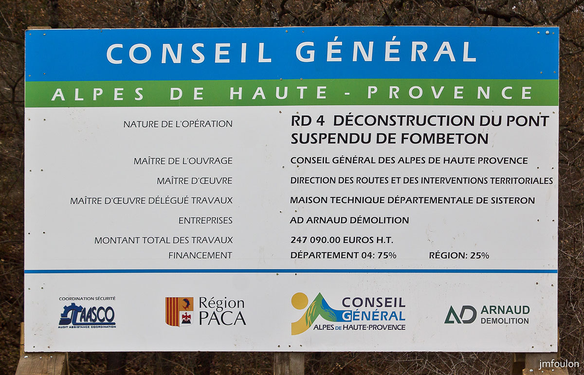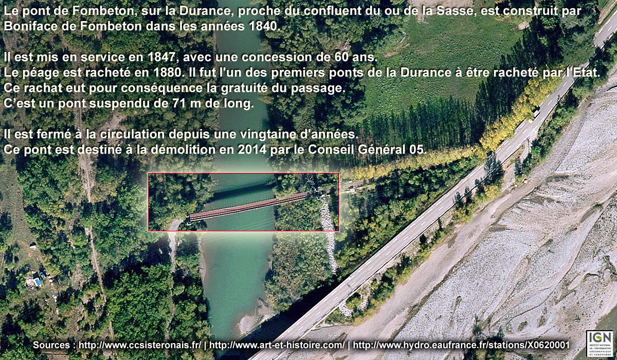 Quelques photo du Pont de Fombeton qui enjambait la Durance près de sa confluence avec le Sasse.Il a été détruit en 2014. Voici qu'elle images du pont et de son démentellement.