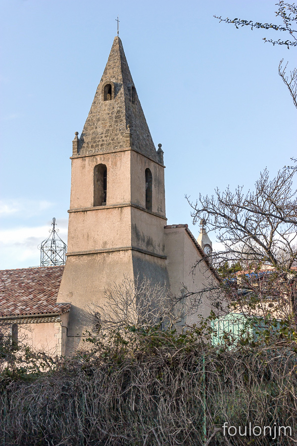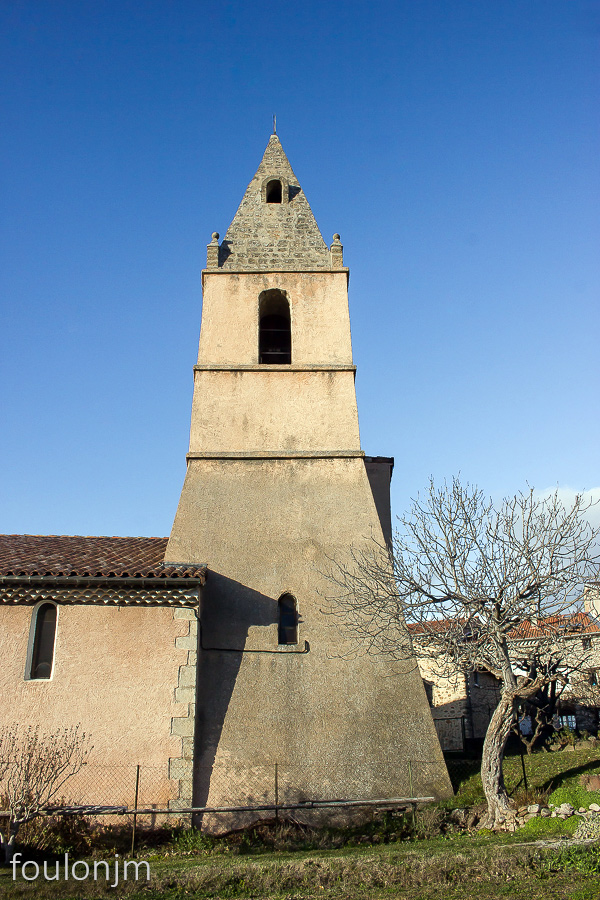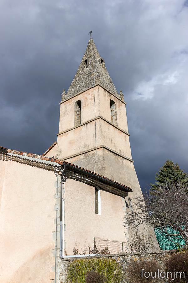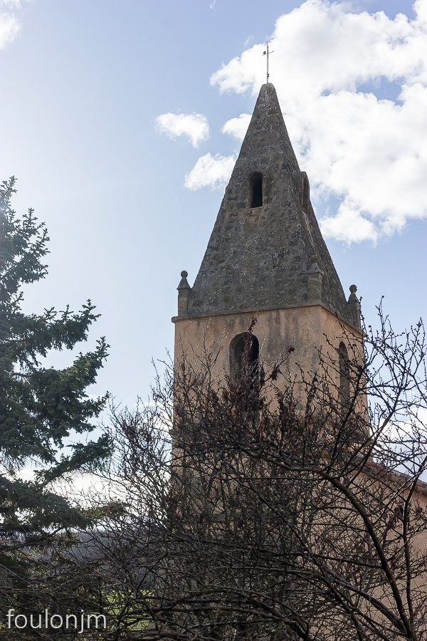 57Le Poët - Hautes Alpes Eglise Saint Pierre - Le clocher. Sa base est évasée pour renforcer son assise au sol ...