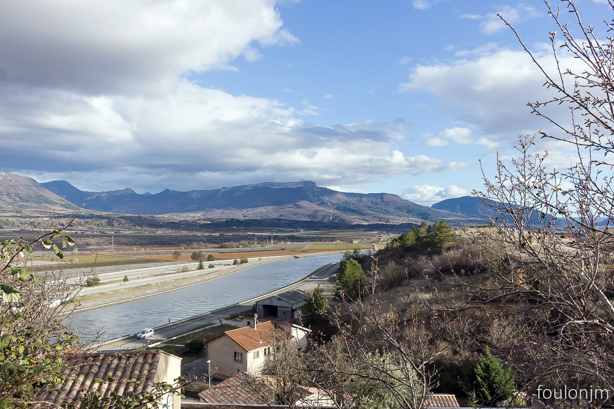 31Le Poët - Hautes Alpes Vue vers l'Est depuis la motte castrale. Au loin à gauche, le Rocher de Hongrie. En bas le canal et l'A 51dans la vallée de la Durance ...