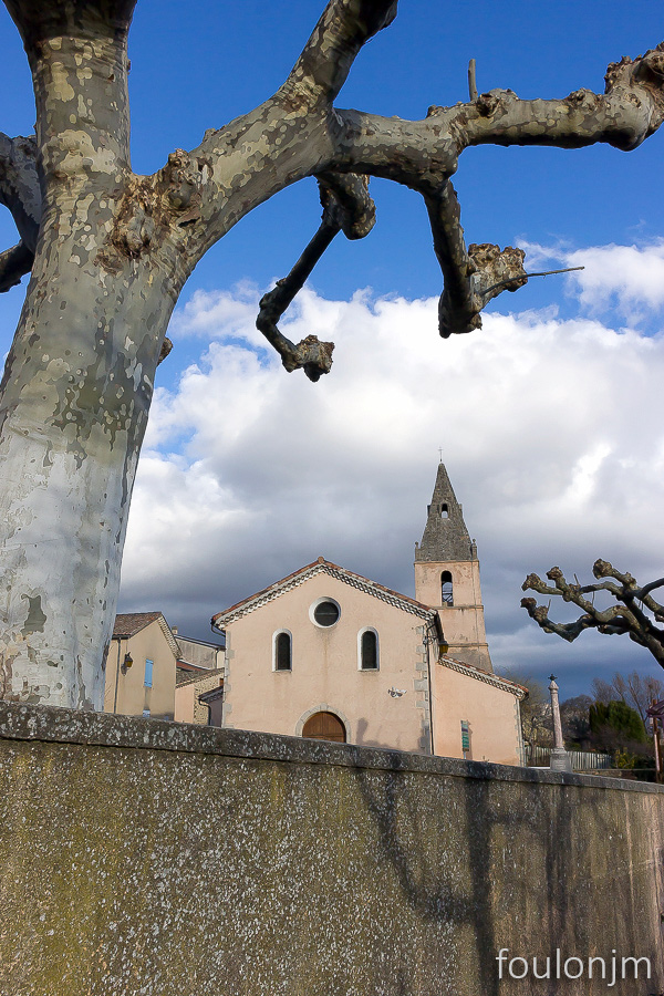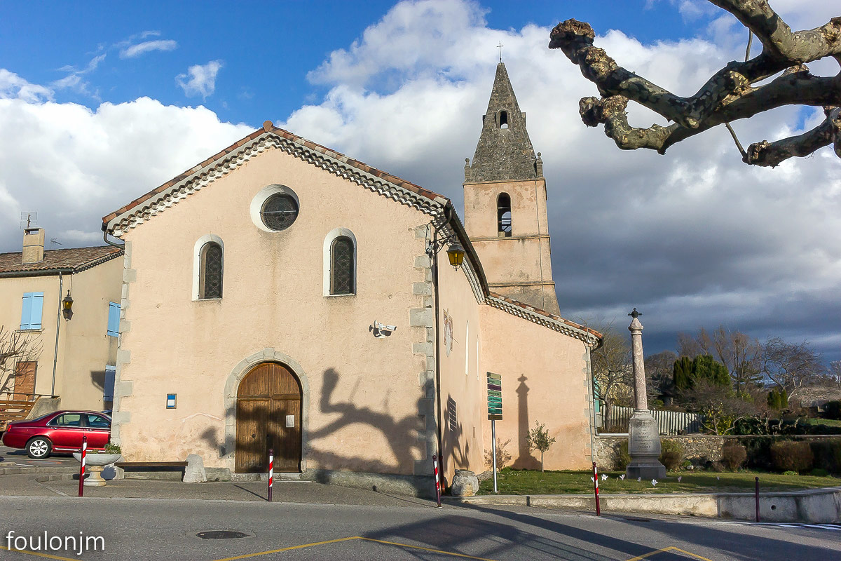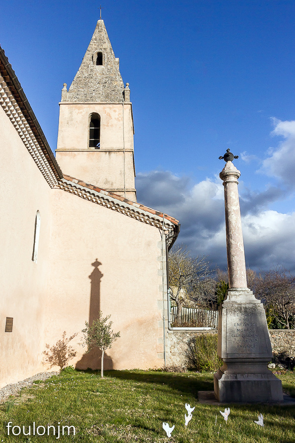 55Le Poët - Hautes Alpes Eglise Saint Pierre - Façade Ouest et Sud. A droite, le monument au mort et l'arbre de la Liberté (un olivier encore petit) ...