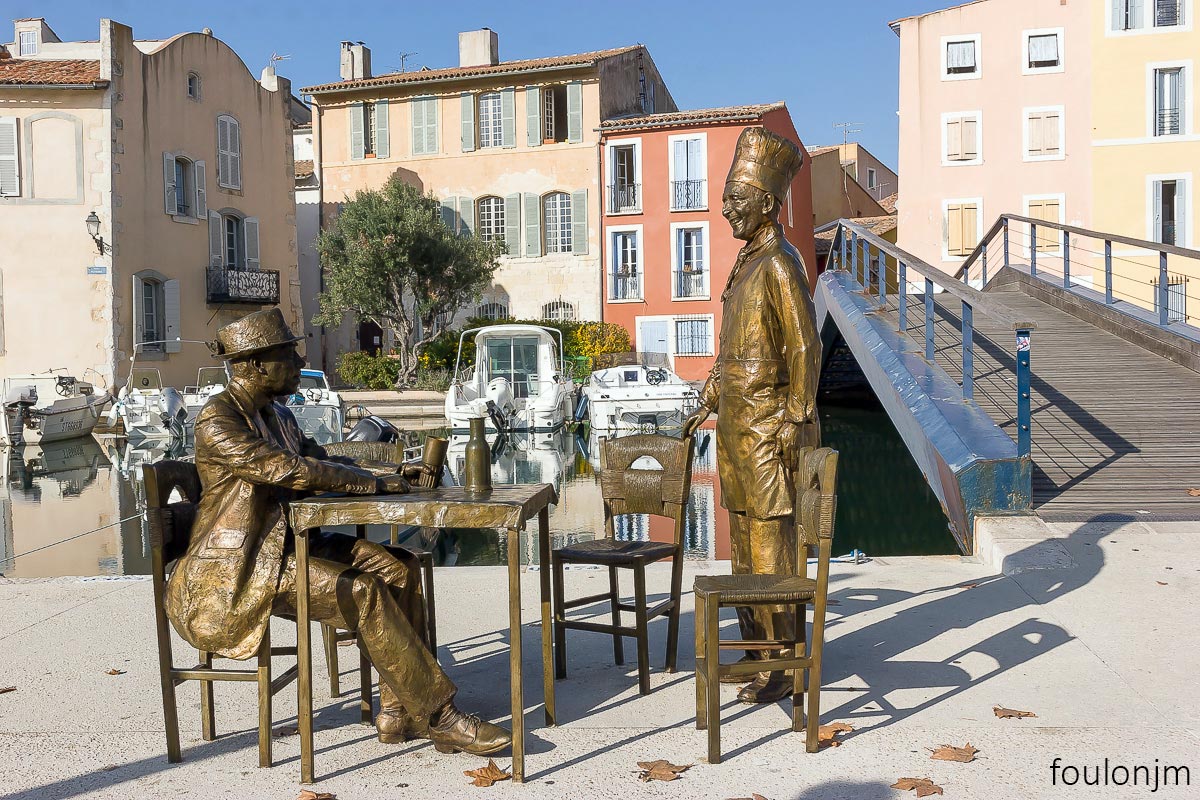 32Martigues - L'île Statues de bronze, représentant Fernandel et Bourvil dans une scène emblématique de " la cuisine au beurre ". Le sculpteur Sébastien Langloÿs, a laissé trois chaises à disposition pour que les touristes et locaux y prennent place. 2/2