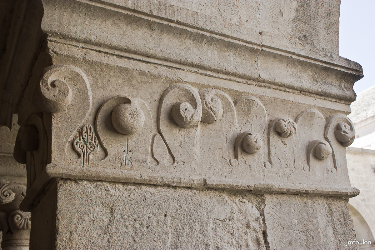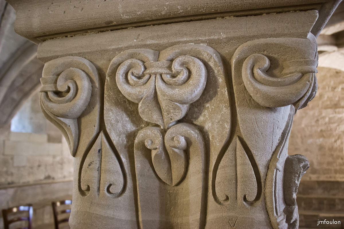 48 Abbaye de Sénanque - Le chauffoir. Cette petite salle est voûtée de quatre voûtes d'arêtes qui retombent au centre sur cette robuste colonne dont le chapiteau est orné de feuilles d'eau et de fleurs de lys inversées