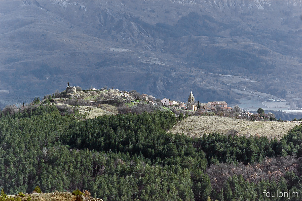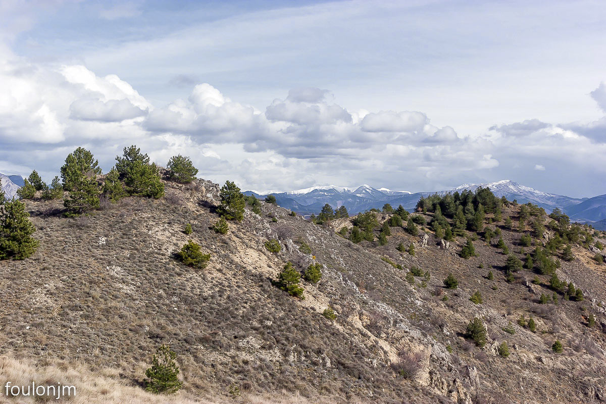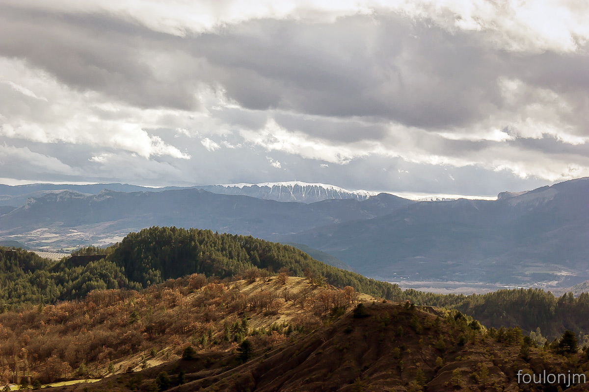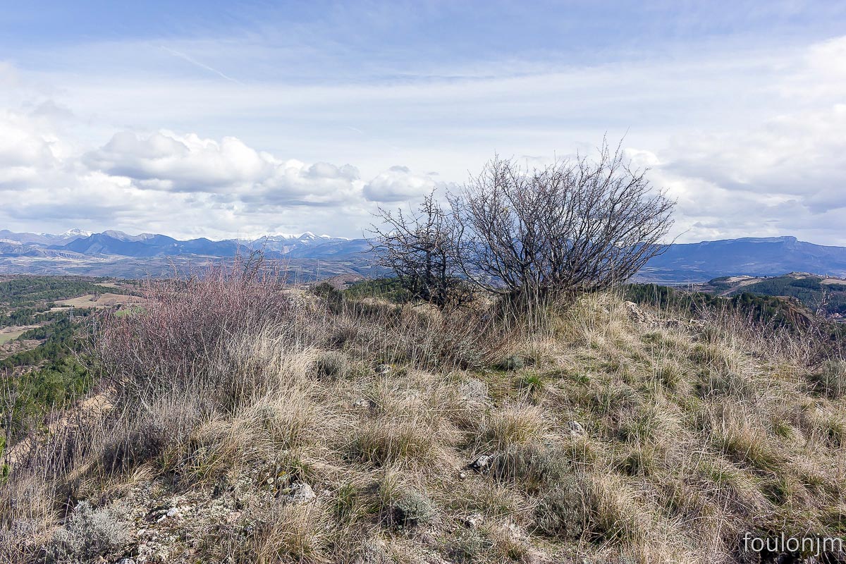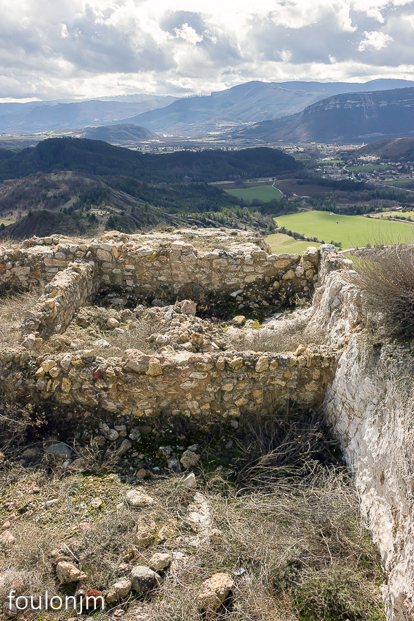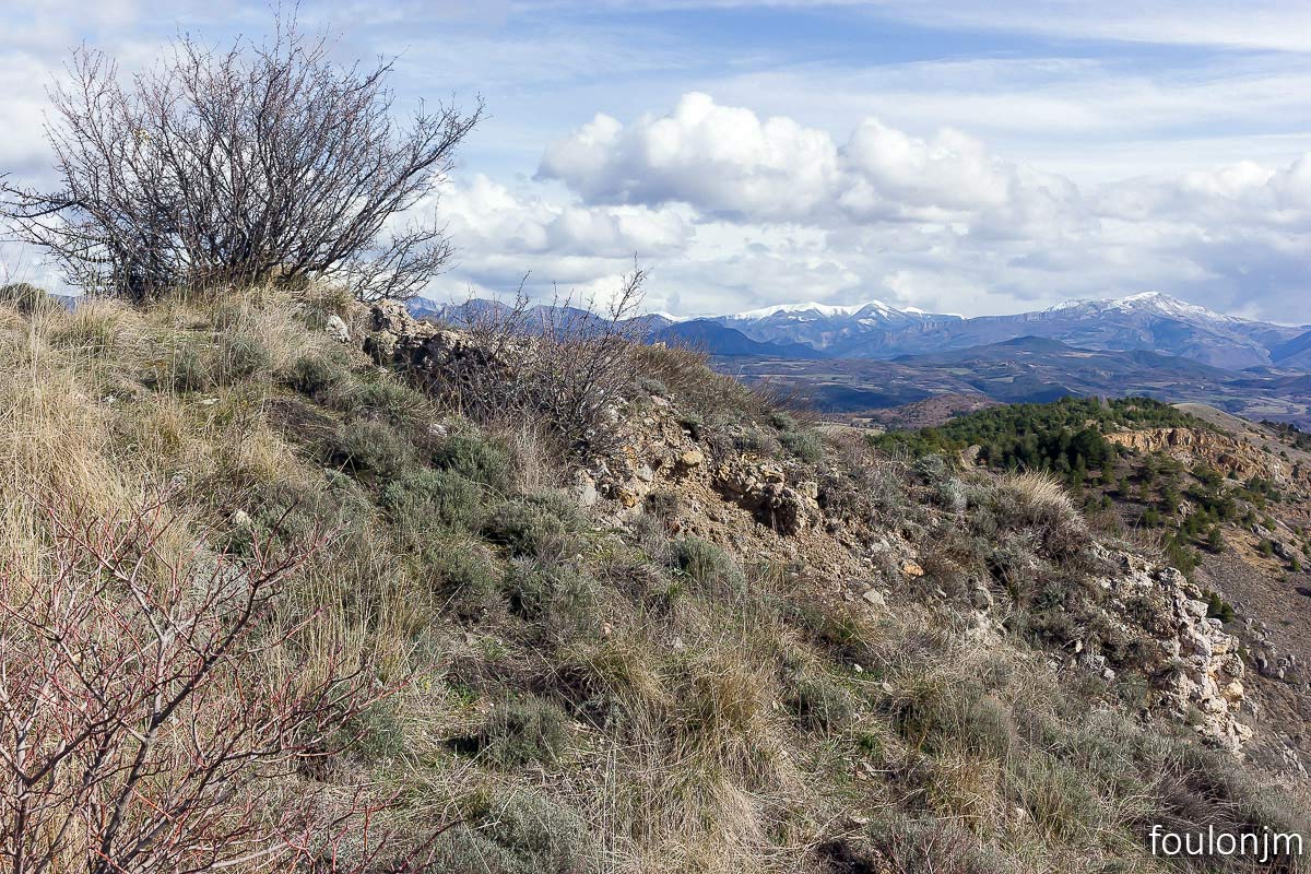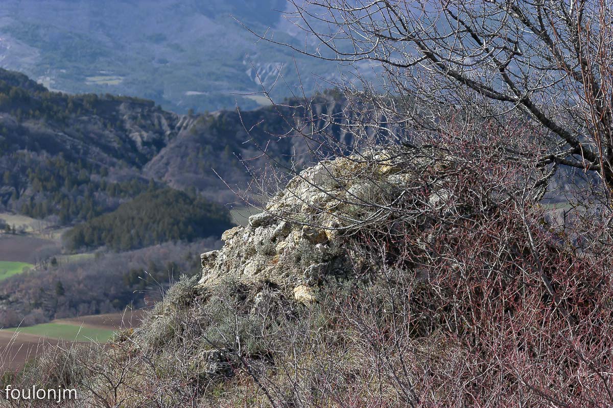 58Lazer - Vestiges du site de la Plâtrière Vue vers le Sud depuis la motte castrale. Au loin, la majestueuse montagne de Lure enneigée ...
